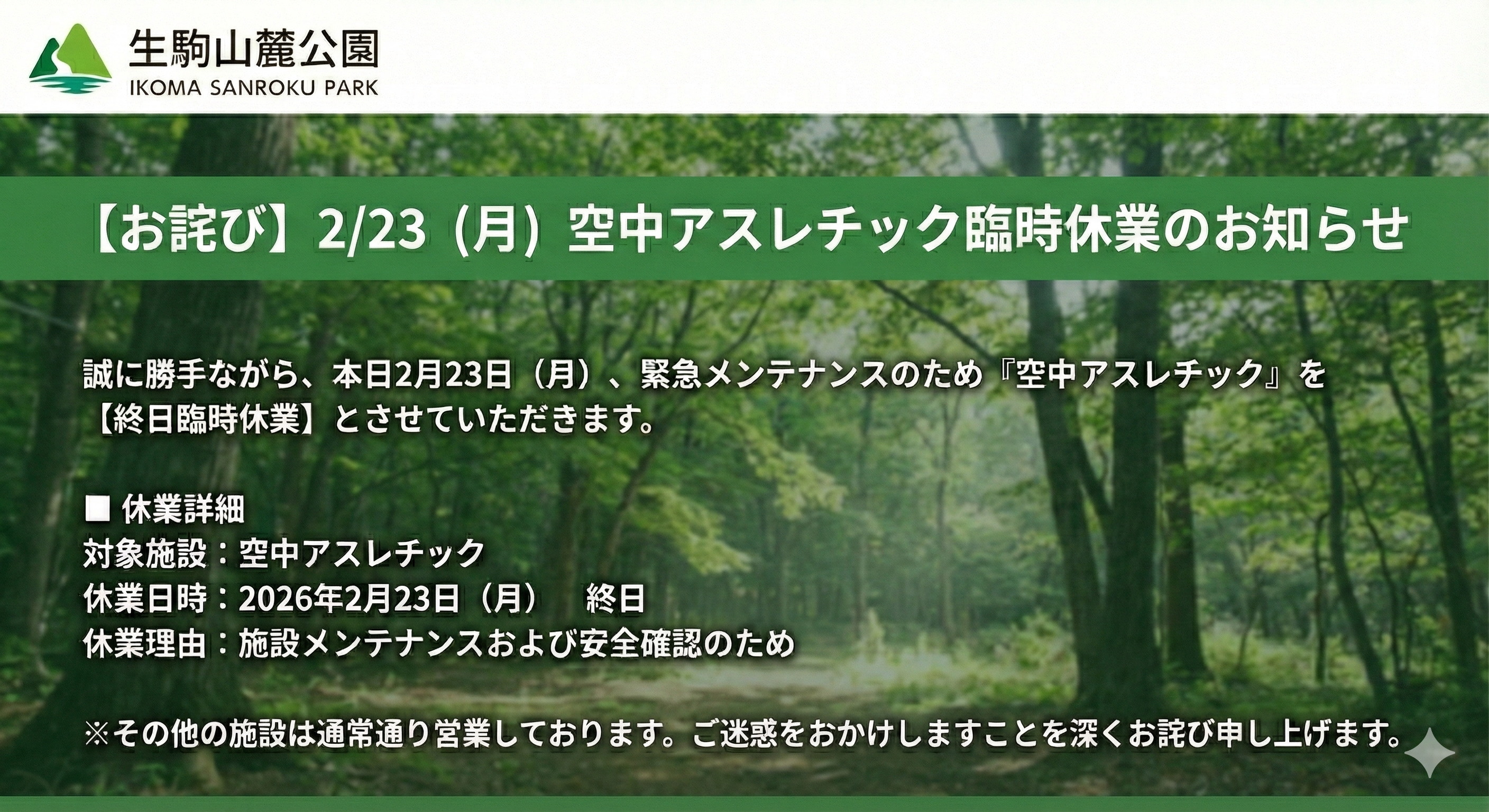 平素より生駒山麓公園をご利用いただき、誠にありがとうございます。