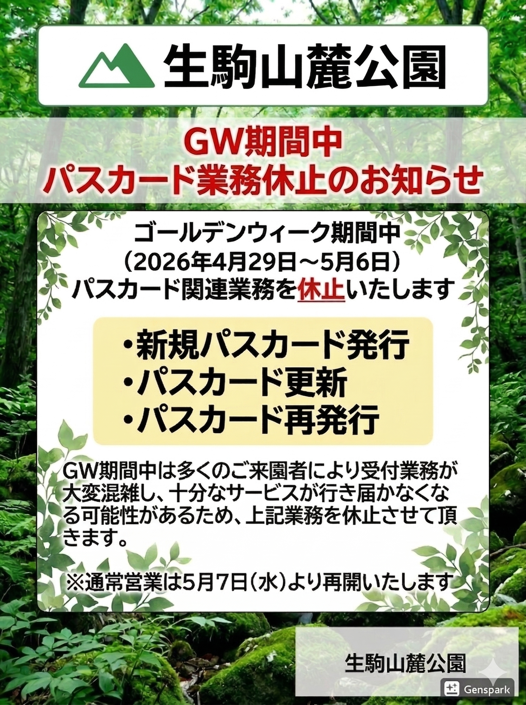 ゴールデンウィーク期間中は、多くのお客様のご来園により受付業務が大変混雑し、十分なサービスが行き届かなくなる可能性があるため、下記の通りパスカード関連業務を休止させていただきます。