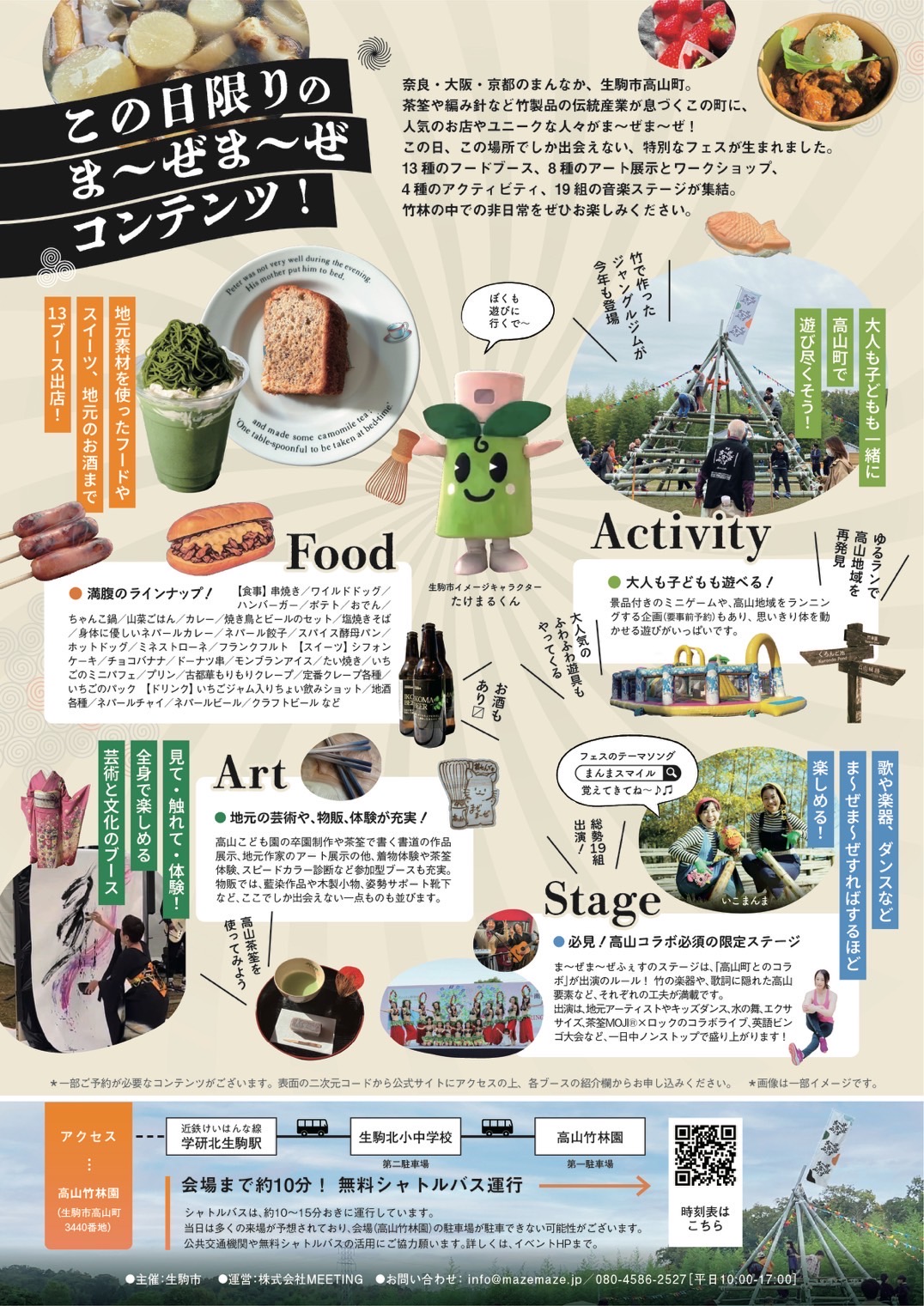 茶筌など竹の伝統産業が息づく高山町に、人気のお店やユニークな人々がジャンルを超えて「ま〜ぜま〜ぜ」になる特別なお祭り。 私たち生駒山麓公園も、このワクワクが止まらない一大イベントに出店することが決定いたしました!
